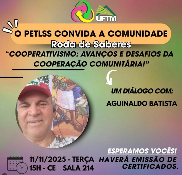 A Roda de Saberes “Cooperativismo: Avanços e Desafios da Cooperação Comunitária!"  será realizada no dia 11 de novembro, às 15 horas, na sala 214, no segundo andar do Centro Educacional da UFTM (CE). O evento é presencial e aberto a toda a comunidade acadêmica, sem necessidade de inscrição prévia. Haverá lista de presença no local para posterior emissão de certificados. Aguinaldo Batista, coordenador Estadual do MST, participará da Roda de Conversa, que também é coordenada pelo Programa de Educação Tutorial Conexões de Saberes, Licenciaturas e Serviço Social (PET LSS) e pela Cooperativa dos Recolhedores Autônomos de Resíduos Sólidos e Materiais Recicláveis de Uberaba – COOPERU.