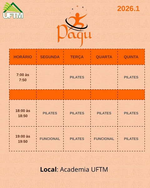 O Programa oferece aulas de Pilates e Funcional para a comunidade. O Pilates, no período da manhã, às terças e quintas-feiras das 7 às 7h50, no período da noite, de segunda à quinta-feira das 18h às 18h50 e na terça e na quinta feira das 19h às 19h50.