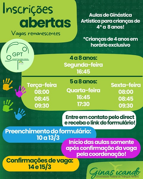 O projeto de extensão Ginasticando, coordenado pelo Departamento de Ciências do Esporte da UFTM, está com vagas abertas para o primeiro semestre de 2026. São oferecidas aulas de...