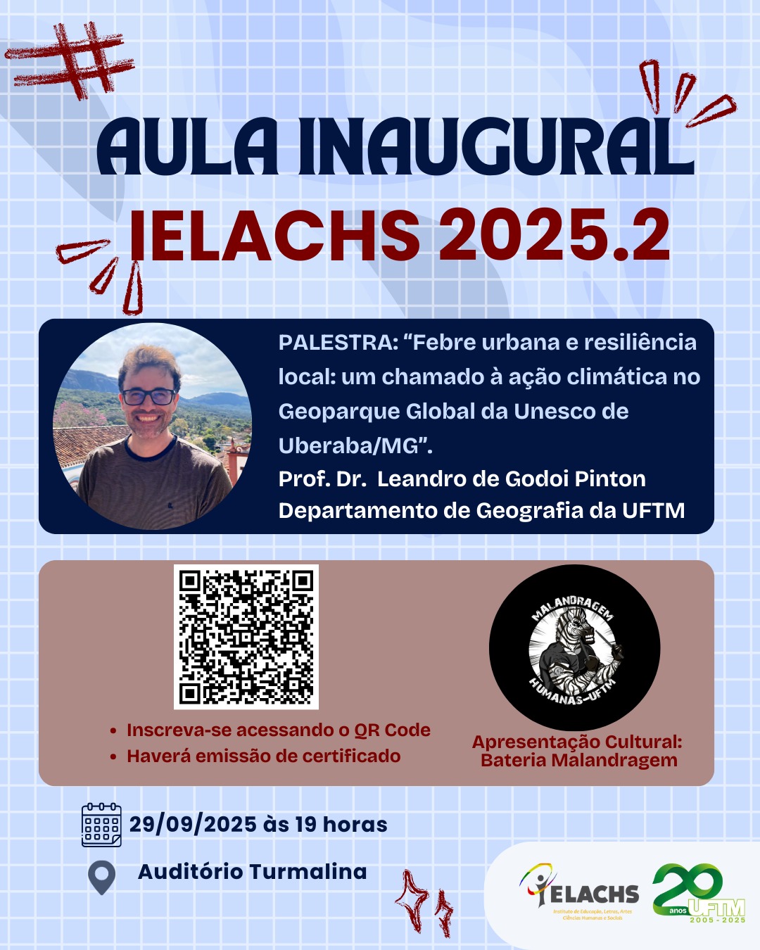 No dia 29 de setembro, às 19h, acontecerá a Aula Inaugural IELACHS 2025.2. O evento será no Auditório Turmalina, localizado no Centro Educacional UFTM.  Na Aula Inaugural, o...