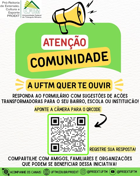 A Pró-reitoria de Extensão, Cultura e Esporte (PROEXT) da UFTM convida a todos a participar da Consulta...
