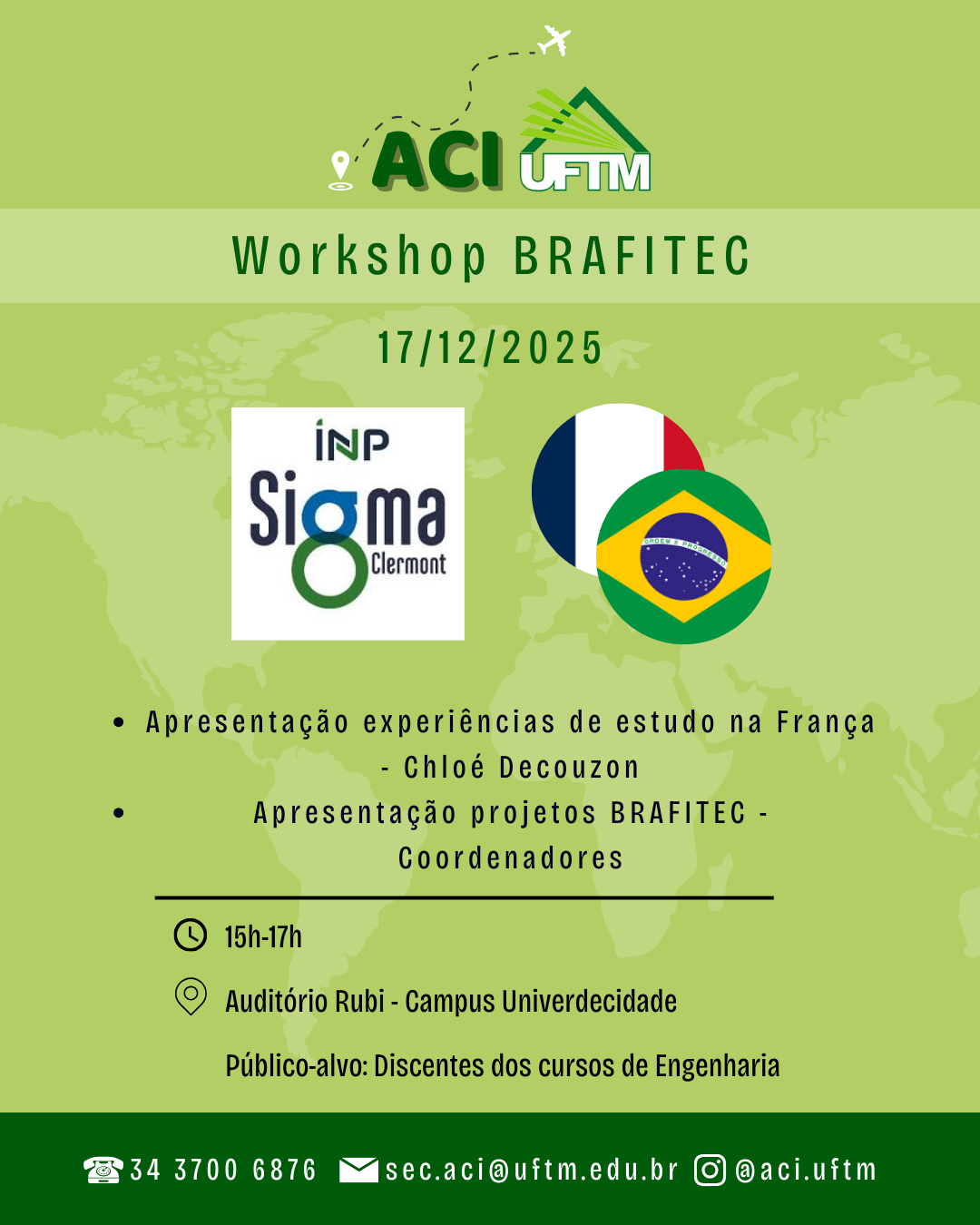 Dia 17 de dezembro serão apresentadas experiências de intercâmbio estudantil na França e os projetos em parceria entre UFTM e universidades francesas. O Workshop BRAFITEC 2025...