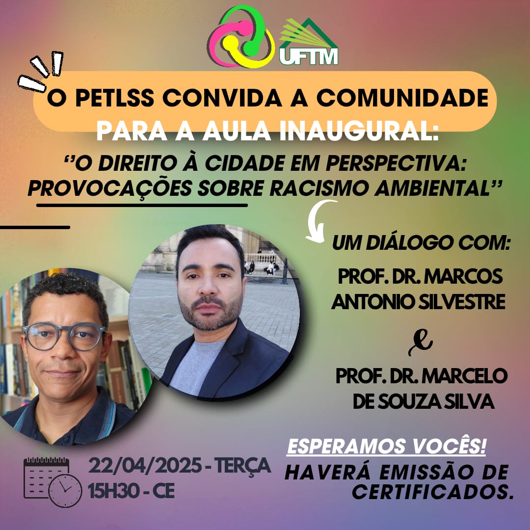 O Programa de Educação Tutorial - Conexões de Saberes, Licenciaturas e Serviço Social (PETLSS) convida a comunidade acadêmica para participar da Aula Inaugural: "O Direito à Cidade em Perspectiva: Provocações sobre Racismo Ambiental."