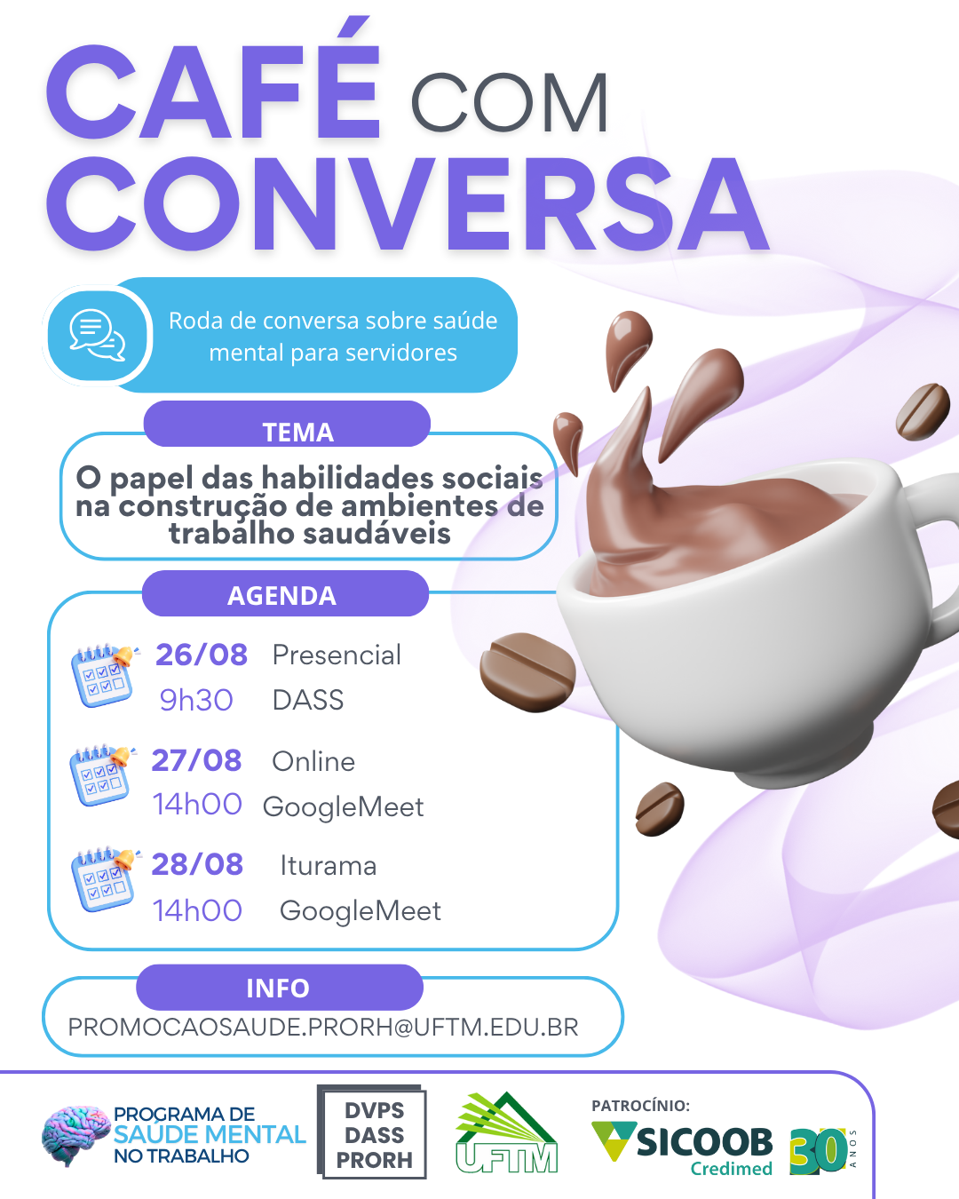 O programa Café com Conversa é uma ação que visa promover o cuidado em saúde mental dos servidores e faz parte do Programa de Saúde Mental no Trabalho do Departamento de...
